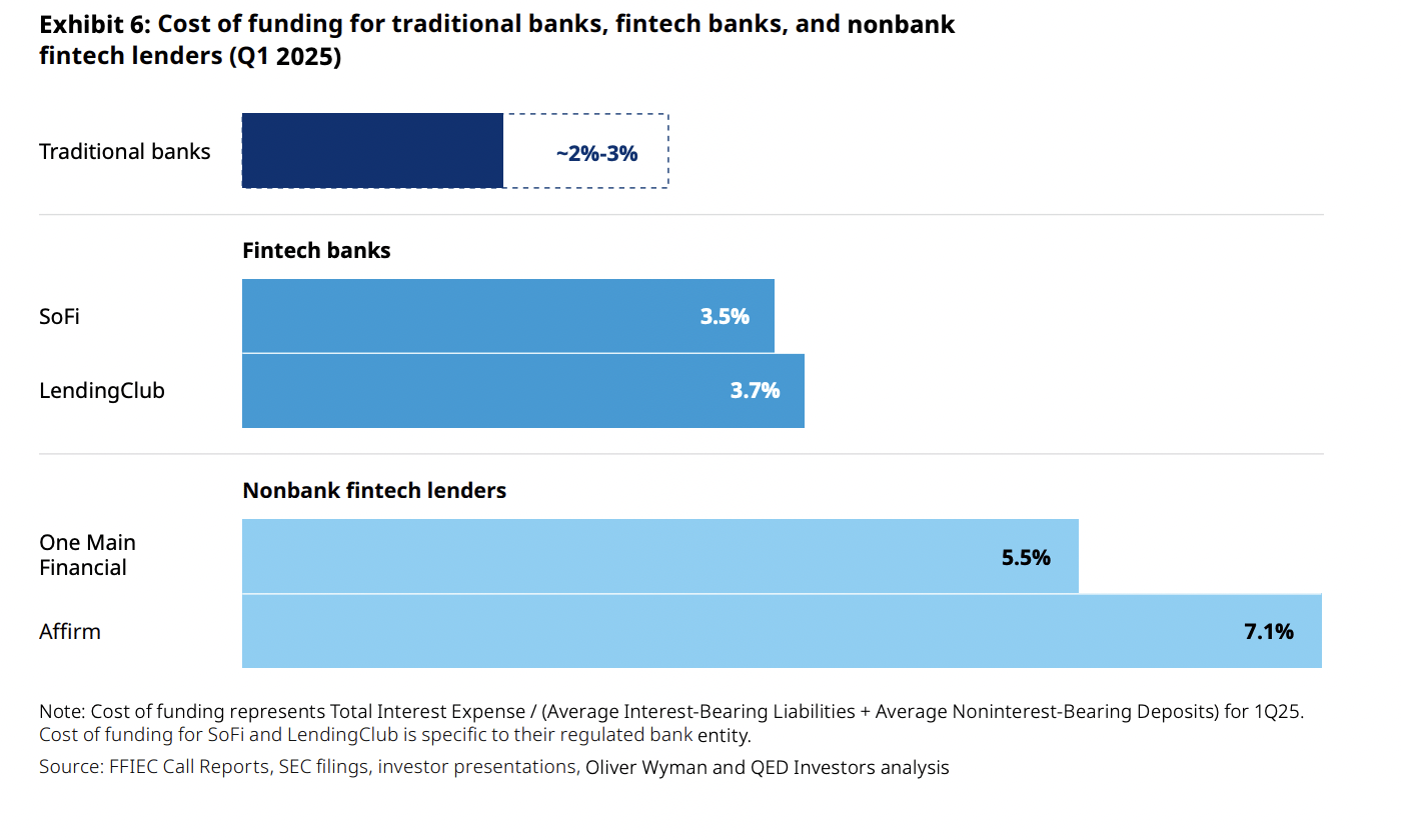 Economics. Relying on a sponsor bank means sharing the economics and inheriting their tech debt. A charter grants principal membership with Visa/Mastercard or access to the Fed. Stripe isn't doing this for prestige; it's doing it to avoid the sponsor bank tax on every swipe. The cost of funding chart above tells the story: traditional banks pay 2-3%, nonbank lenders pay 5.5-7.1%. That delta is the prize.