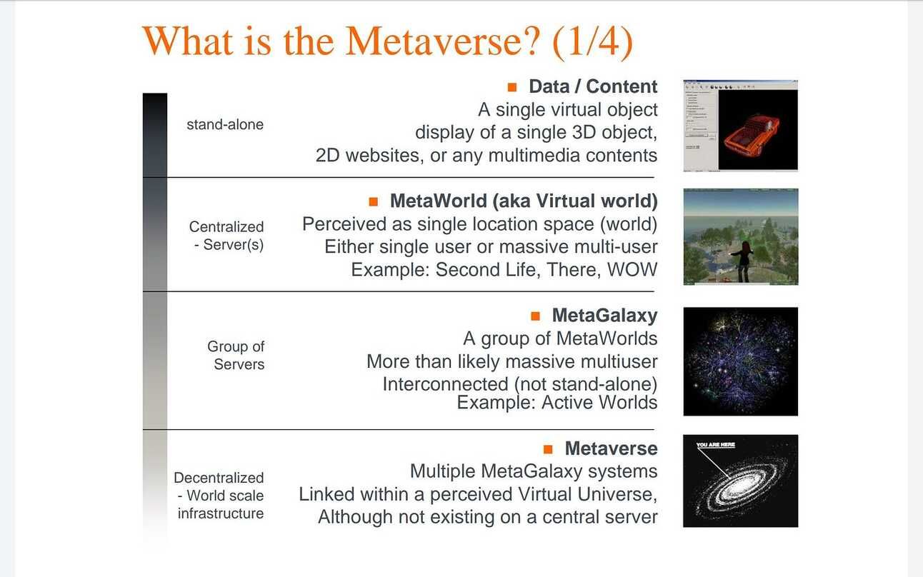 The most used metaphor is to imagine the world of the movie Ready Player One. In which all games and forms of content come together into one giant VR universe. It implies interoperability between IP and a persistent digital universe complete with its economy and rules. This definition is imperfect, though, because it implies the Metaverse is purely about entertainment.