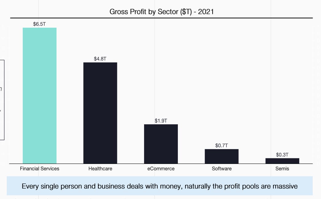 Financial services remain the world's largest profit pool so the prize for innovating and succeeding is massive. It's also everywhere. Finance is a horizontal that cuts across every industry, and often things that don't look like finance are, in fact finance.