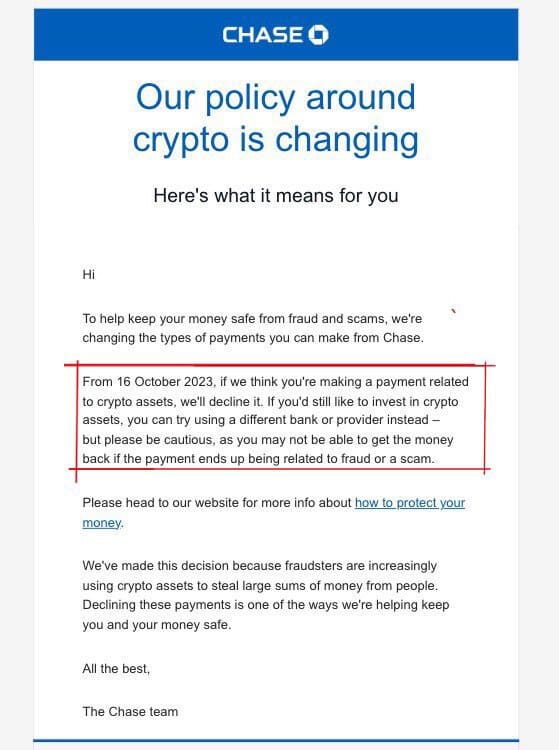 From the 16th of October, Chase UK will block any payments related to Cryptoassets. Their note to customers says, "If you'd like to buy Cryptoassets, you can use another bank instead."