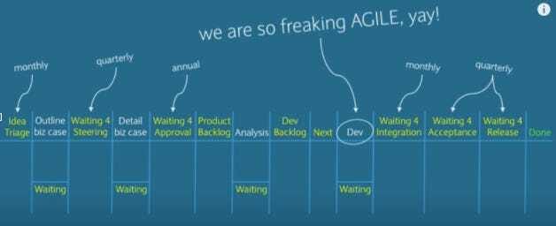 In incumbents where change meets funding or any of the various risk forums, that process is far from agile (or agile at scale); it is exceptionally waterfall. Yet incumbents spend hundreds of millions with strategy consultancies to try and deliver "agile at scale." The problem with these "agile at scale" programs is they're all focused on the symptoms, not the cause.
