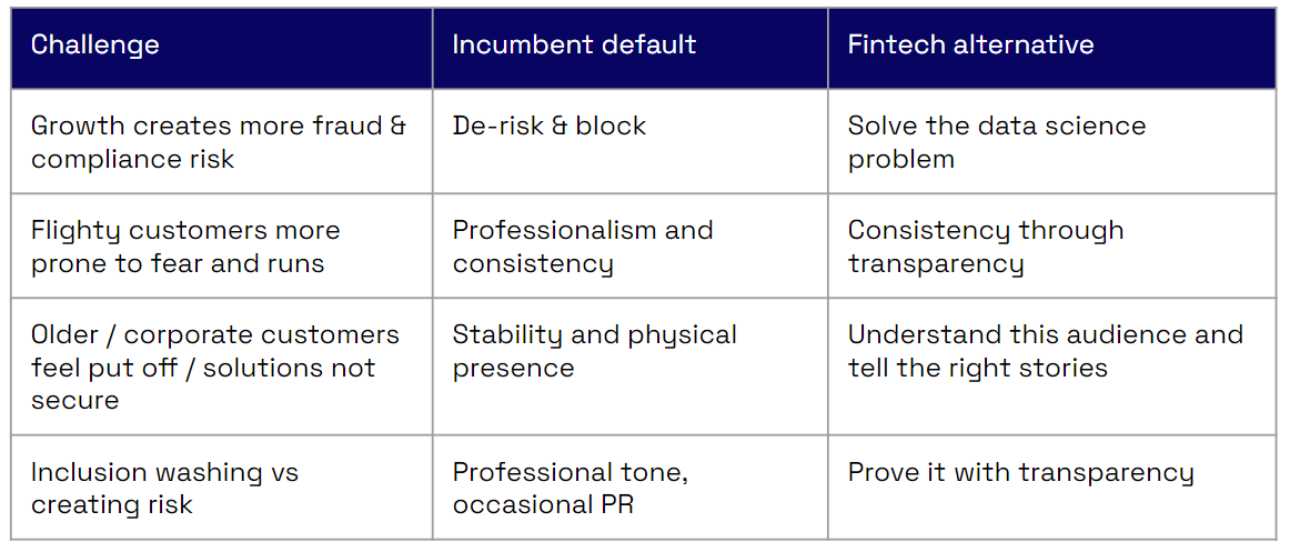 d) Messaging around inclusion can quickly become inclusion-washing. How many Fintech companies are "democratizing access to finance?" It's something they nearly all say. On the one hand, I doubt we would have cashflow-based underwriting as an industry norm if it weren't for Fintech companies. Conversely, Fintech companies also top the league table for high-risk of fraud and delinquencies.
