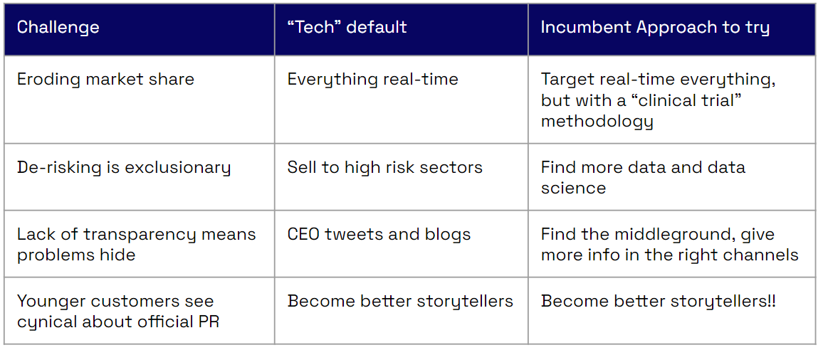 a) Better Innovation through consistency: Instead of accepting eroding market share or making a sweeping decision to default-real-time, incumbents could use their consistency to target consistently moving faster as a KPI. This will take years to get right. But it's a powerful north star. Many have already headed this way in the larger banks, but how many governance processes are measured in months?