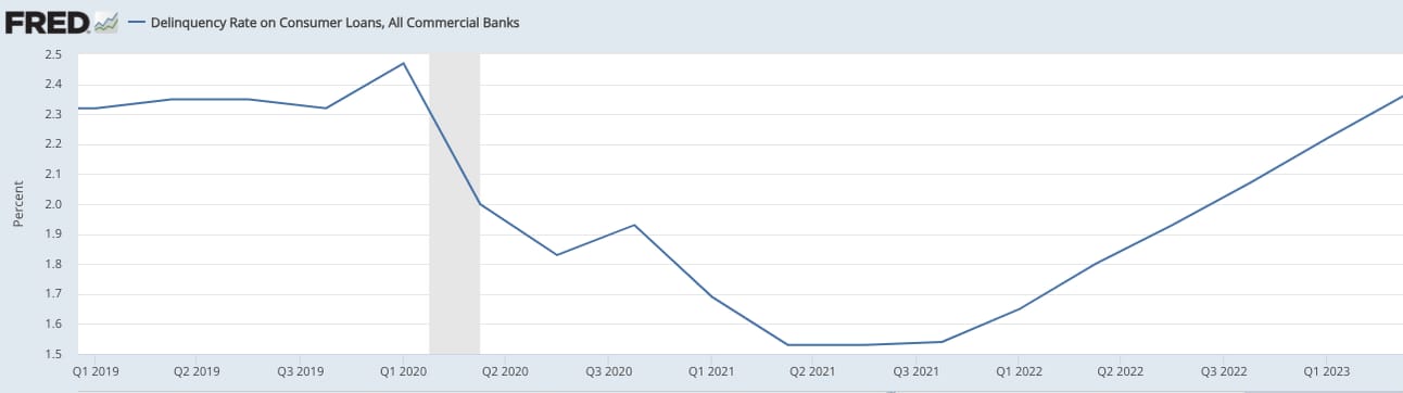 a) Delinquency rates are rising quickly. First off, borrowers found themselves struggling to repay. On the business lending side, sales slowed as the economy slowed, and revenue couldn't keep pace with the required debt repayments. On the consumer side, discretionary spending shrank as inflation squeezed household budgets, putting pressure on debt repayments.