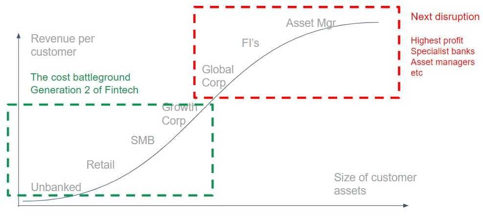 d) The next phase of financial services is the cost battleground. Incumbents generate a lot of revenue by being diversified and having a wide product catalog. Disruptors come from beneath with lower costs and gradually diversify their offerings to generate more revenue. But the reality is that this cost battleground plays out at all levels.Â