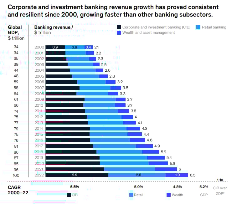 Corporate and Investment Banks generated $2.9trn of revenue with RoE of 12% in 2022. Banks are on solid footing a decade and a half from the financial crisis, but performance isn't even. The five big shifts are: