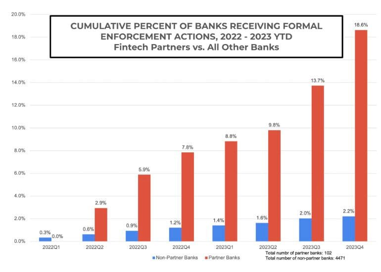 a) B2B Fintech relies on sponsor banks under enormous pressure from regulators. Since the first half of 2022, formal enforcement actions by regulators are up across the US banking sector; however, this is much more pronounced with partner banks. The promise of partner banking wasn't always matched with investment in risk and compliance. That is changing. Partner banks are getting their act together (and many already did). But partner banking is an entirely new go-to-market and risk model.