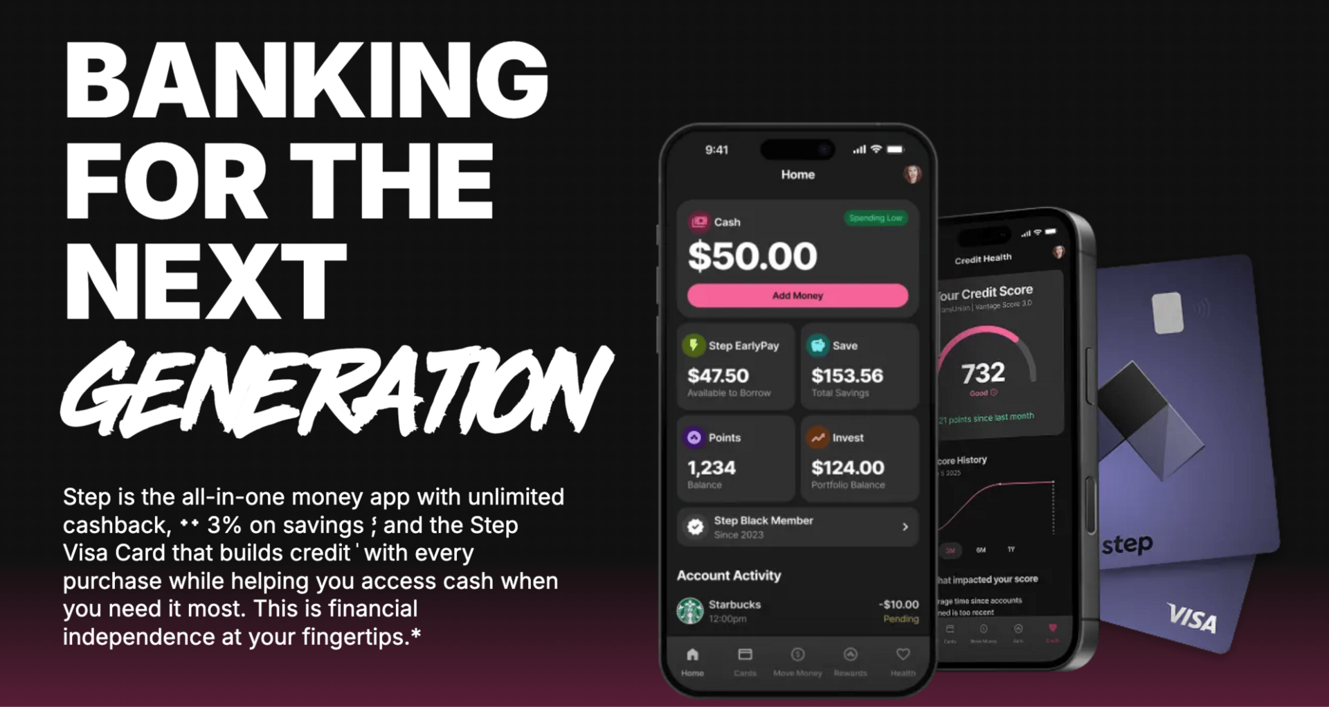 Step is unapologetically the finance app for teens. Not for parents and teens, but for the teens themselves. Launched with the mission to give the "unbanked" youth a head start, it bypasses traditional barriers with no-fee accounts and a unique credit-building Visa card that works like a debit card but reports to credit bureaus.