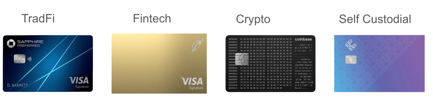 Examples | Chase, BofA | Revolut, Chime | Coinbase, Crypto.com | Gnosis Pay, Ether.fi |