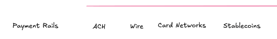 Payment rail layer: How do we complete the payment? Execution on cards, ACH, stablecoins.