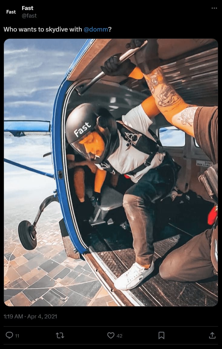 Dominic "Domm" Holland positioned himself as the high-energy frontman of Fast.com. He had a gift for marketing, regularly pulling stunts like skydiving or pulling donuts in a NASCAR truck as the "World's fastest CEO." Merchandise like hoodies would be sent out to willing fans and Fastronauts. His social channels gave a steady stream of founder and entrepreneur advice, and social media lapped it up.