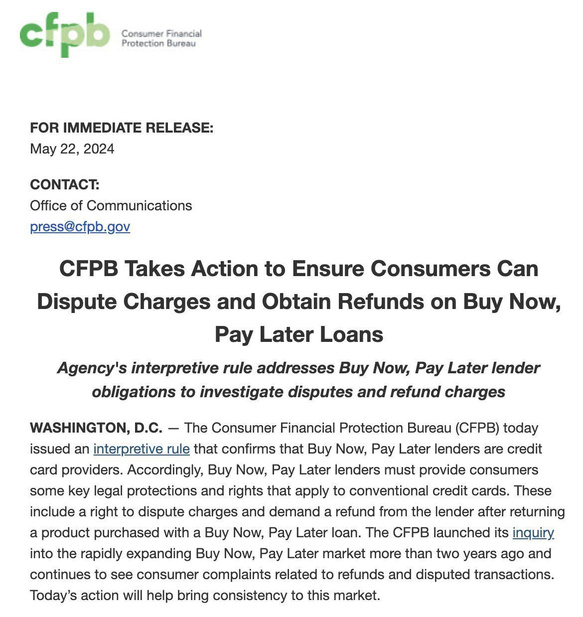 The Consumer Financial Protection Bureau has published an interpretive rule that stipulates BNPL providers are credit cards. The aim is to ensure consumers can dispute charges, claim refunds, and have clear disclosures made available to them.