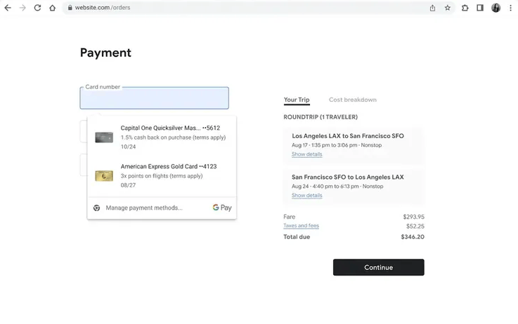 Love this. When a user hits checkout and is prompted to enter a card number, the browser “autofill” list will display the available benefits from stored cards. The feature is live today with a some AMEX and Capital One cards.